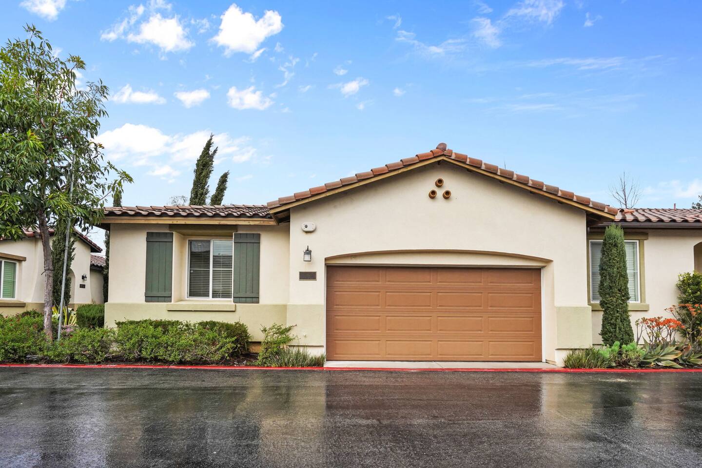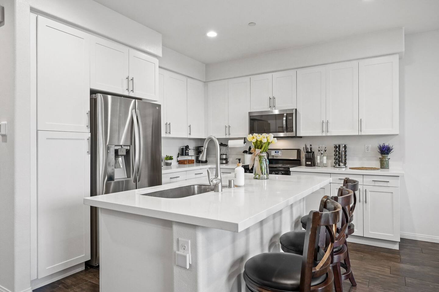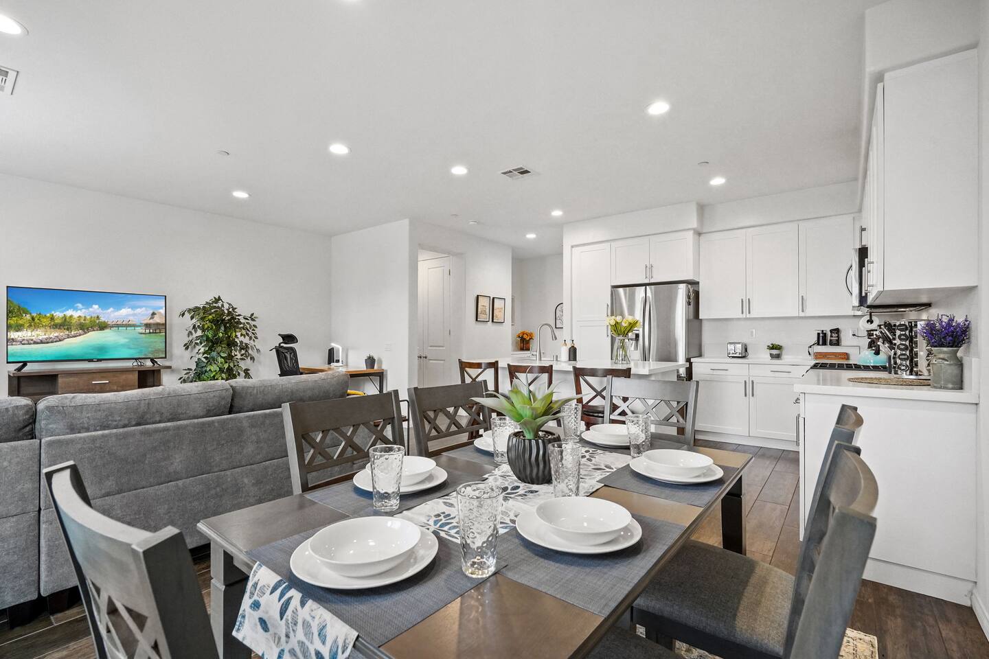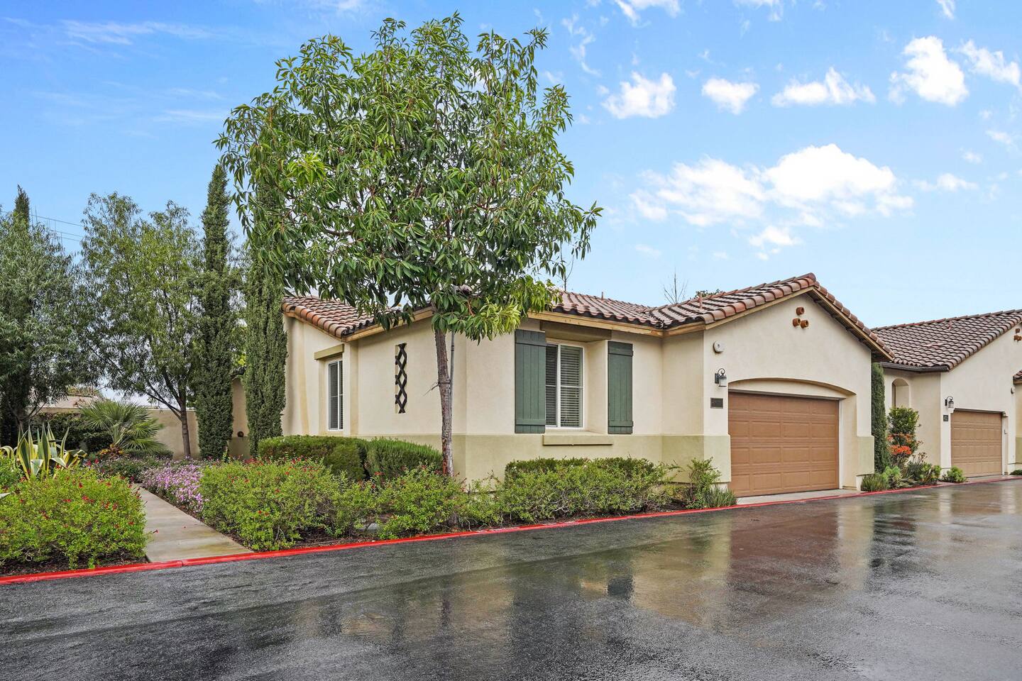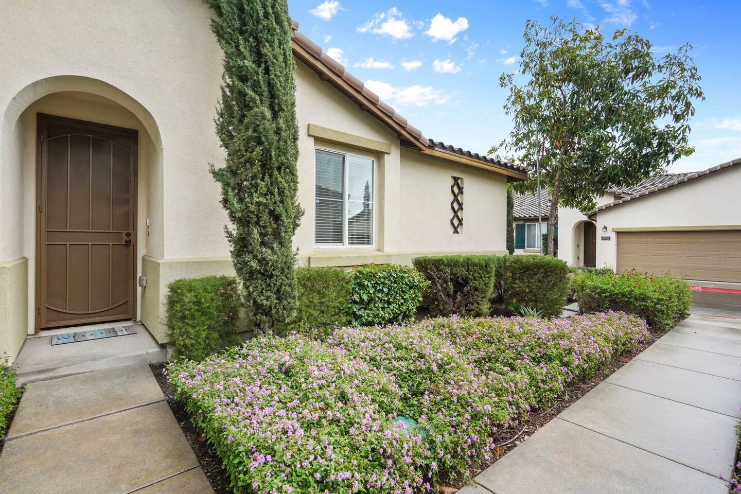 KEY HIGHLIGHTS: --> EV CHARGER / PARKING: garage plus two dedicated parking spaces, additional street parking available inside the community. --> BEDROOM COMFORT: Plush mattresses in bedrooms with 2 queens and 2 twins, designed for a restful sleep plus dressers, privacy blinds for a longer stay. --> ACCESSIBILITY: One-story, stair-free entry, walk-in shower in the master suite for easy access. --> MODERN KITCHEN AND DINING: Our kitchen is fully stocked and features a breakfast bar, new stainless appliances, and a gas stove, making it perfect for preparing meals or entertaining guests. The open floor plan includes a dining area that opens up to the great room, providing multiple spaces for enjoyment and relaxation. --> OUTDOOR LIVING AREA: Lush backyard garden patio for relaxation or dining al fresco. In the front, the community space includes a BBQ, firepit, Bocce Ball and pet walking area. --> CONVENIENCE: Washer and dryer in home. --> SAFE COMMUNITY AND AMENITIES: Step outside to enjoy the beautifully maintained community grounds, featuring an outdoor fireplace, BBQ patio, seating for gatherings, a bocce ball court, and a pet-friendly area for your furry friends to explore. --> PRIME LOCATION FOR EXPLORERS AND PROFESSIONALS: Located 3 min from the 55, 22, 57 freeways, our home offers easy access to Irvine + Tustin, Disney, Ducks Hockey and Angels Baseball stadium, many grocery and shopping centers, business parks, and dining options. 2 min from Santiago Canyon College. LOCATION AND ATTRACTIONS Centrally located 1 mile off 55 freeway and 5 freeway • CHOC, Providence and other hospitals 10 minutes • 10 min to Irvine, Tustin, Anaheim Hills • Easy access to shopping, dining, and outdoor activities. • A serene, quiet street that's still "super close to the action." • Minutes to Disneyland, Anaheim Convention Center, Angels Stadium, and more. ACCESSIBILITY FEATURES No stairs for entry and a master suite designed to accommodate guests with mobility needs. FOR PET OWNERS A small dog door and pet-friendly community areas ensure your furry friends enjoy their stay as much as you do.