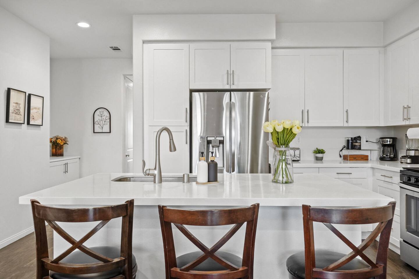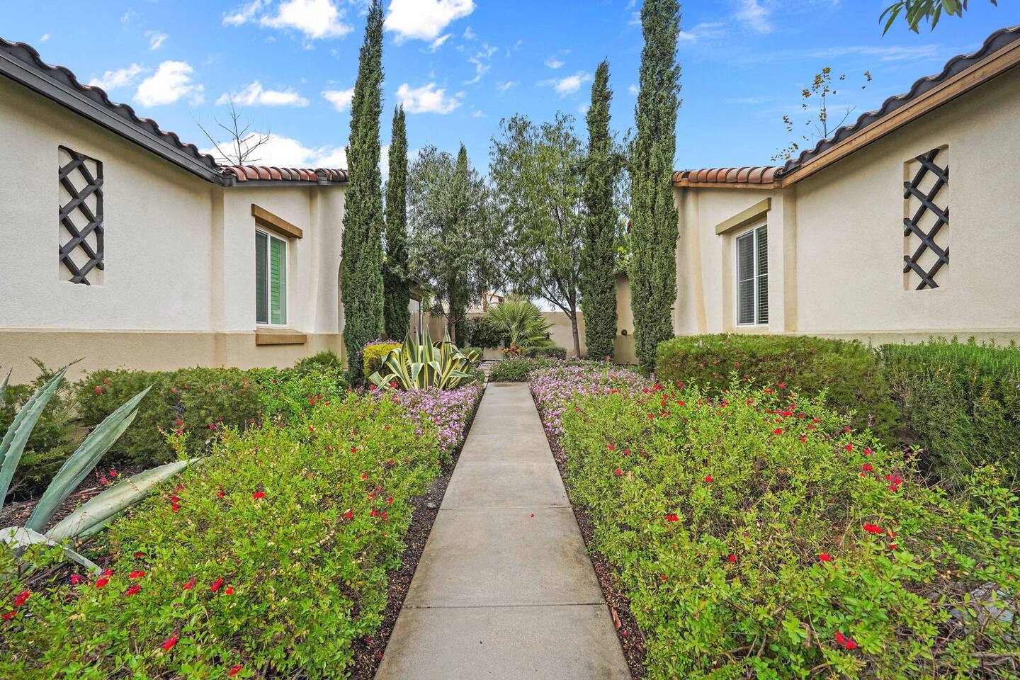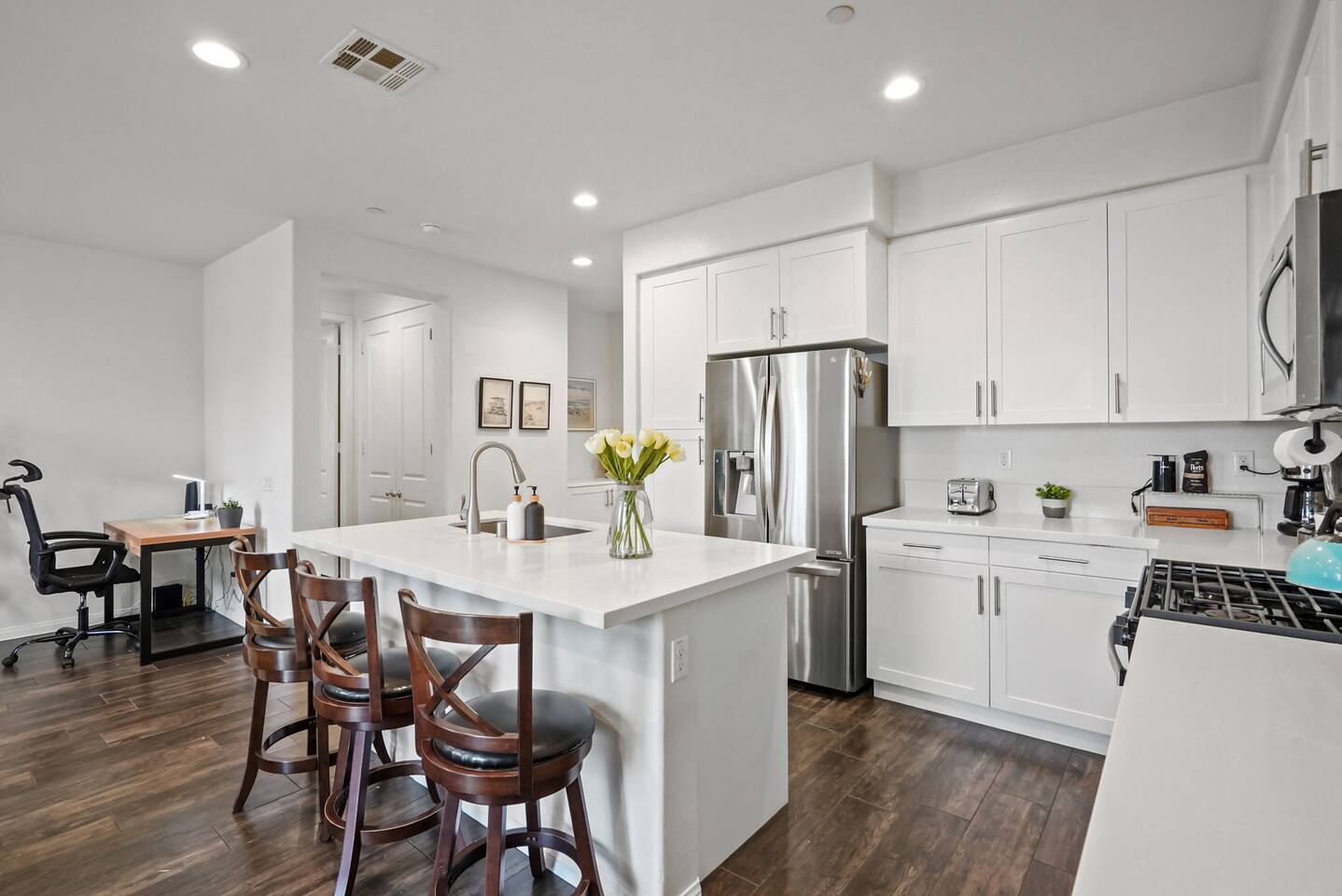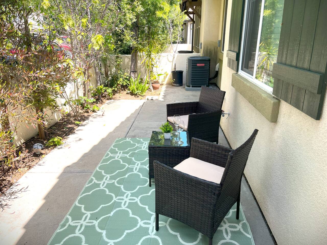 KEY HIGHLIGHTS: --> EV CHARGER / PARKING: garage plus two dedicated parking spaces, additional street parking available inside the community. --> BEDROOM COMFORT: Plush mattresses in bedrooms with 2 queens and 2 twins, designed for a restful sleep plus dressers, privacy blinds for a longer stay. --> ACCESSIBILITY: One-story, stair-free entry, walk-in shower in the master suite for easy access. --> MODERN KITCHEN AND DINING: Our kitchen is fully stocked and features a breakfast bar, new stainless appliances, and a gas stove, making it perfect for preparing meals or entertaining guests. The open floor plan includes a dining area that opens up to the great room, providing multiple spaces for enjoyment and relaxation. --> OUTDOOR LIVING AREA: Lush backyard garden patio for relaxation or dining al fresco. In the front, the community space includes a BBQ, firepit, Bocce Ball and pet walking area. --> CONVENIENCE: Washer and dryer in home. --> SAFE COMMUNITY AND AMENITIES: Step outside to enjoy the beautifully maintained community grounds, featuring an outdoor fireplace, BBQ patio, seating for gatherings, a bocce ball court, and a pet-friendly area for your furry friends to explore. --> PRIME LOCATION FOR EXPLORERS AND PROFESSIONALS: Located 3 min from the 55, 22, 57 freeways, our home offers easy access to Irvine + Tustin, Disney, Ducks Hockey and Angels Baseball stadium, many grocery and shopping centers, business parks, and dining options. 2 min from Santiago Canyon College. LOCATION AND ATTRACTIONS Centrally located 1 mile off 55 freeway and 5 freeway • CHOC, Providence and other hospitals 10 minutes • 10 min to Irvine, Tustin, Anaheim Hills • Easy access to shopping, dining, and outdoor activities. • A serene, quiet street that's still "super close to the action." • Minutes to Disneyland, Anaheim Convention Center, Angels Stadium, and more. ACCESSIBILITY FEATURES No stairs for entry and a master suite designed to accommodate guests with mobility needs. FOR PET OWNERS A small dog door and pet-friendly community areas ensure your furry friends enjoy their stay as much as you do.