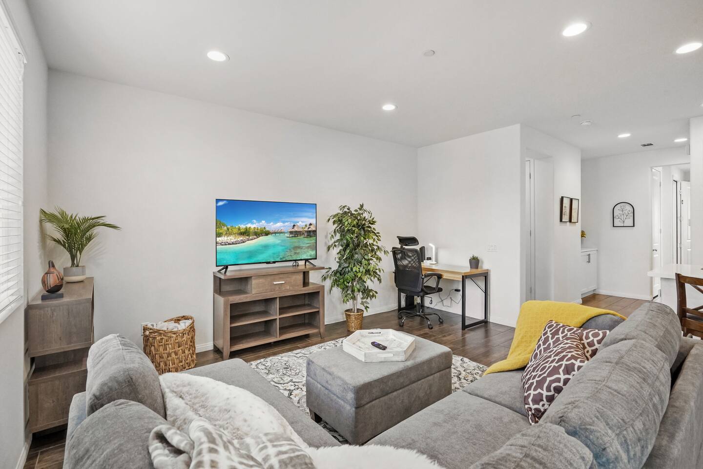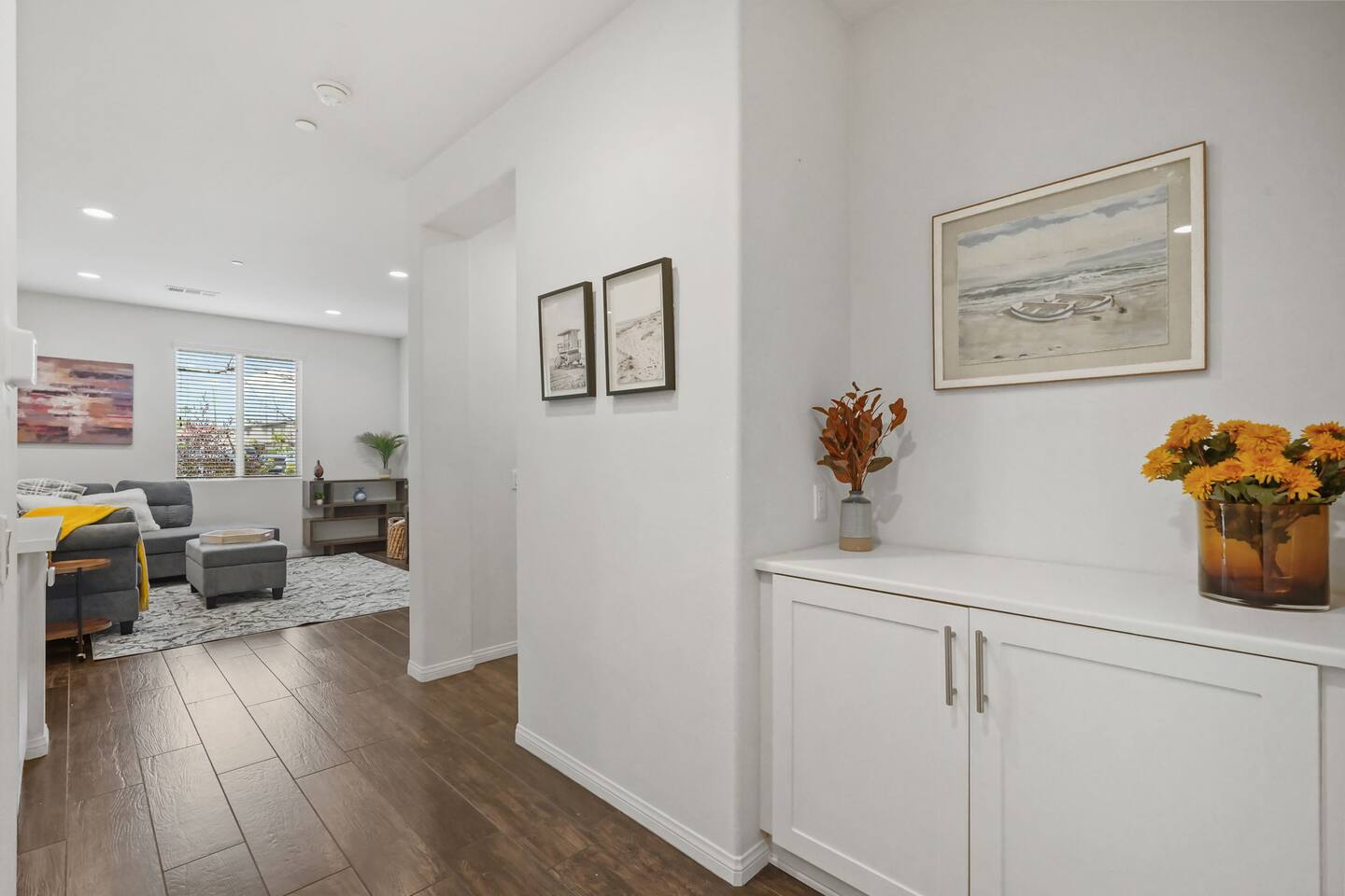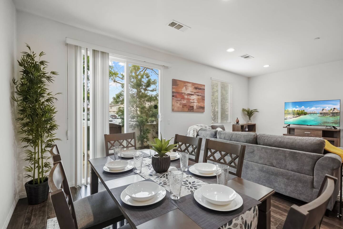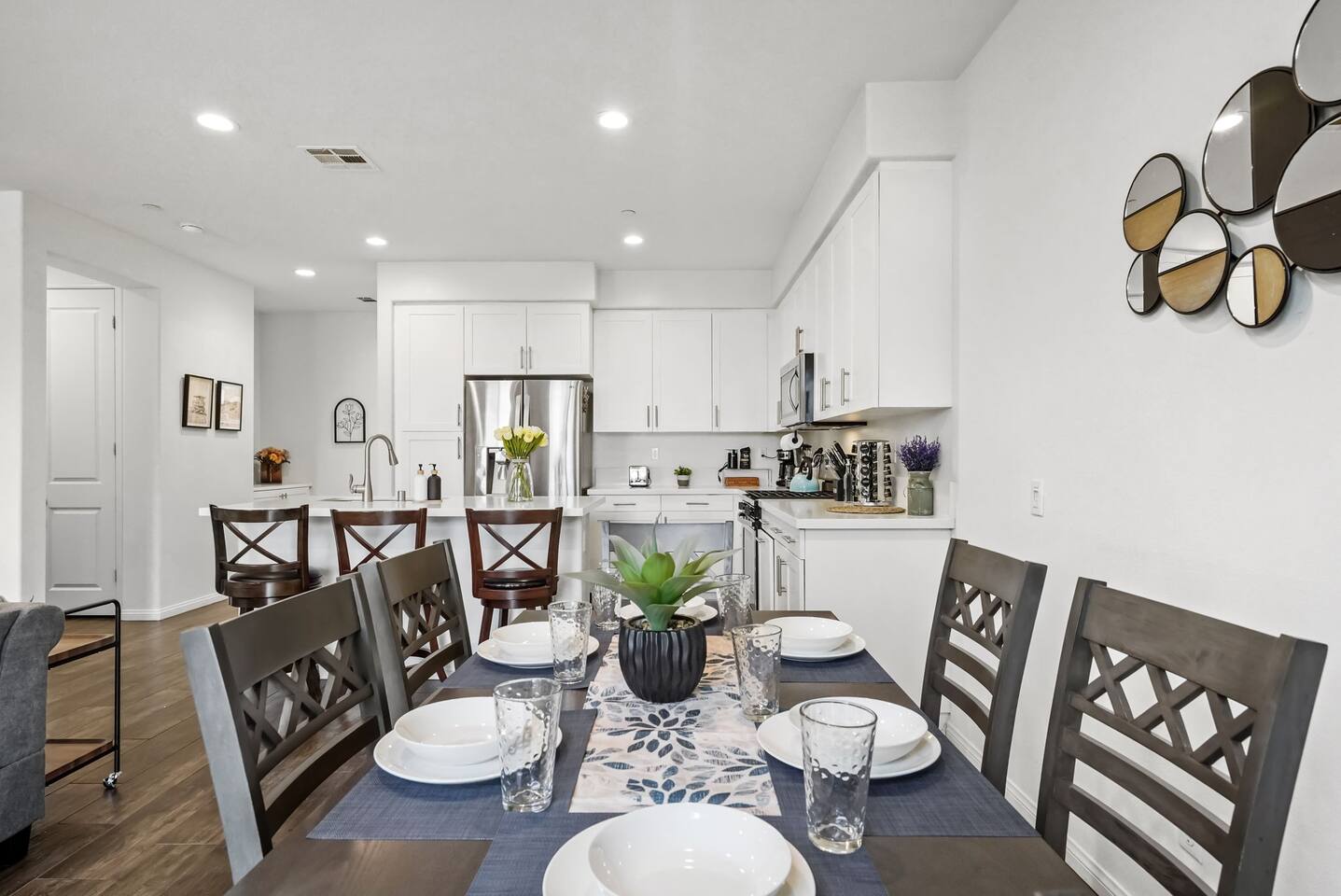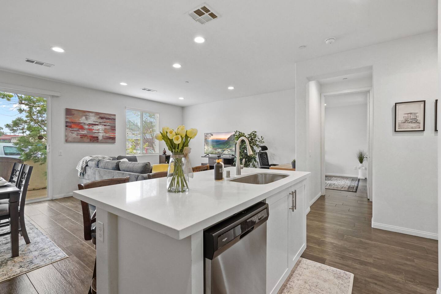 KEY HIGHLIGHTS: --> EV CHARGER / PARKING: garage plus two dedicated parking spaces, additional street parking available inside the community. --> BEDROOM COMFORT: Plush mattresses in bedrooms with 2 queens and 2 twins, designed for a restful sleep plus dressers, privacy blinds for a longer stay. --> ACCESSIBILITY: One-story, stair-free entry, walk-in shower in the master suite for easy access. --> MODERN KITCHEN AND DINING: Our kitchen is fully stocked and features a breakfast bar, new stainless appliances, and a gas stove, making it perfect for preparing meals or entertaining guests. The open floor plan includes a dining area that opens up to the great room, providing multiple spaces for enjoyment and relaxation. --> OUTDOOR LIVING AREA: Lush backyard garden patio for relaxation or dining al fresco. In the front, the community space includes a BBQ, firepit, Bocce Ball and pet walking area. --> CONVENIENCE: Washer and dryer in home. --> SAFE COMMUNITY AND AMENITIES: Step outside to enjoy the beautifully maintained community grounds, featuring an outdoor fireplace, BBQ patio, seating for gatherings, a bocce ball court, and a pet-friendly area for your furry friends to explore. --> PRIME LOCATION FOR EXPLORERS AND PROFESSIONALS: Located 3 min from the 55, 22, 57 freeways, our home offers easy access to Irvine + Tustin, Disney, Ducks Hockey and Angels Baseball stadium, many grocery and shopping centers, business parks, and dining options. 2 min from Santiago Canyon College. LOCATION AND ATTRACTIONS Centrally located 1 mile off 55 freeway and 5 freeway • CHOC, Providence and other hospitals 10 minutes • 10 min to Irvine, Tustin, Anaheim Hills • Easy access to shopping, dining, and outdoor activities. • A serene, quiet street that's still "super close to the action." • Minutes to Disneyland, Anaheim Convention Center, Angels Stadium, and more. ACCESSIBILITY FEATURES No stairs for entry and a master suite designed to accommodate guests with mobility needs. FOR PET OWNERS A small dog door and pet-friendly community areas ensure your furry friends enjoy their stay as much as you do.