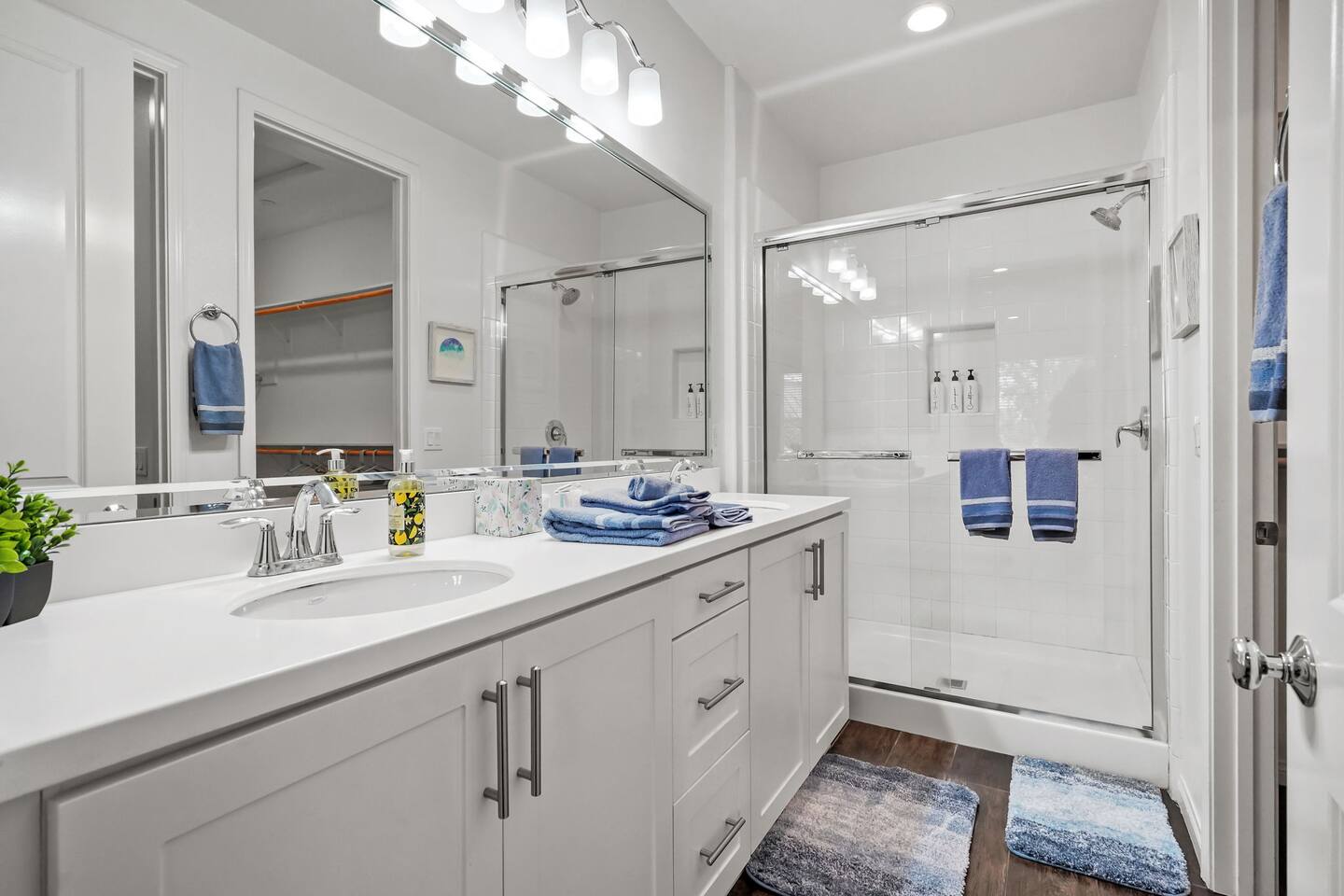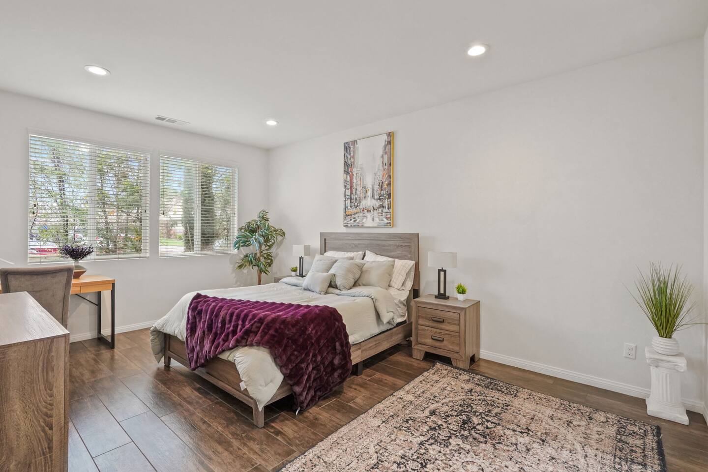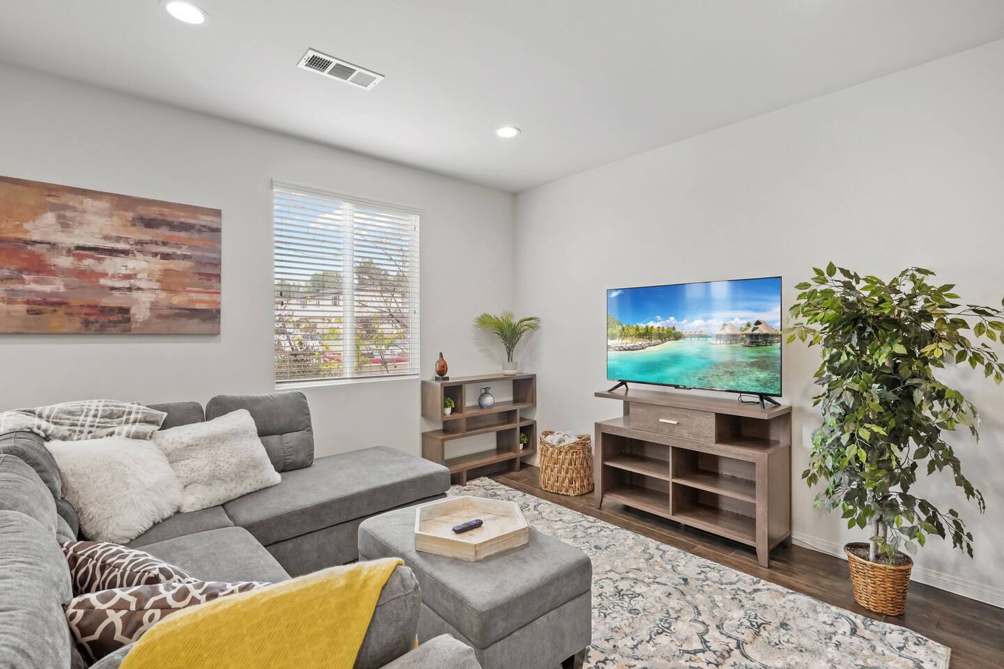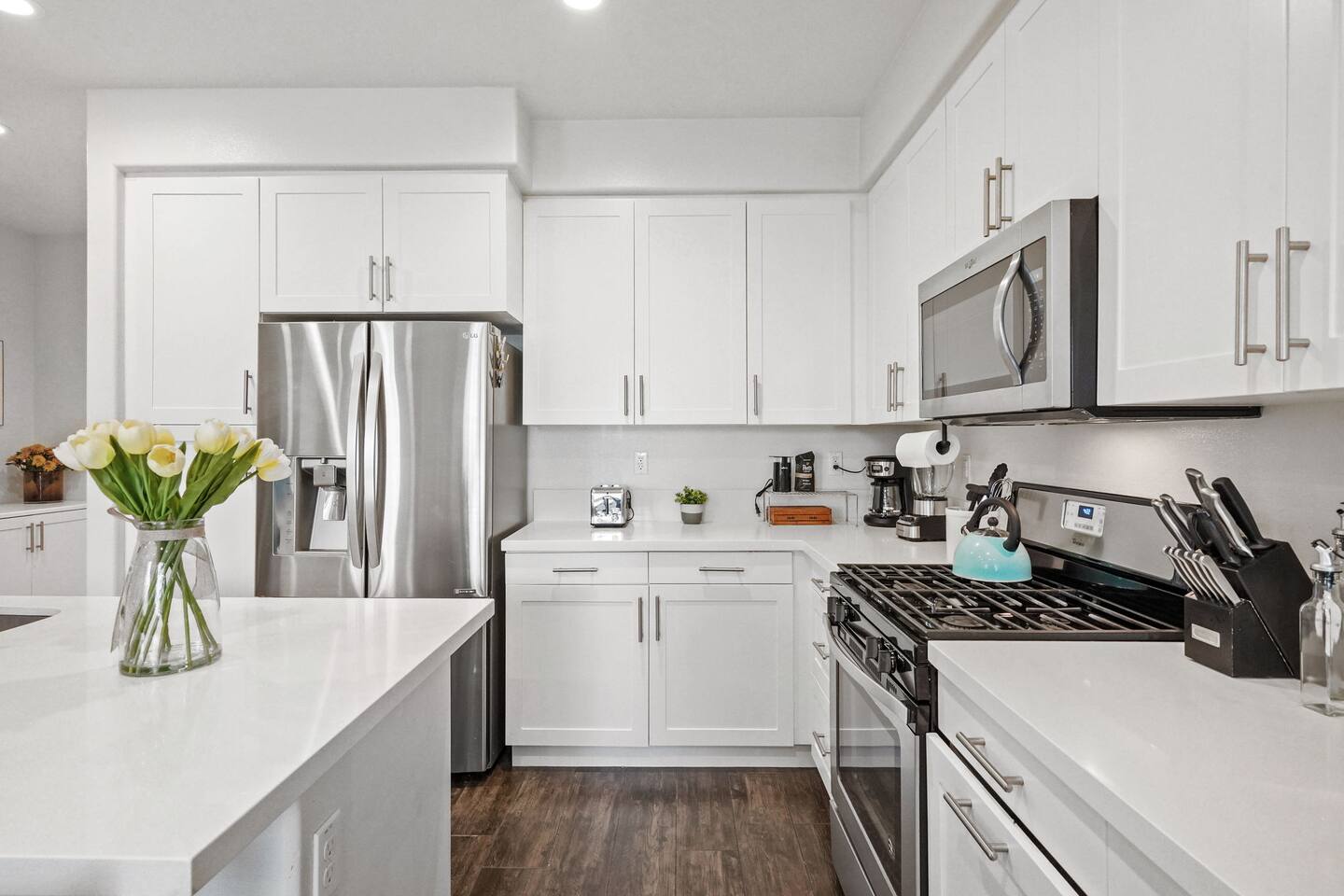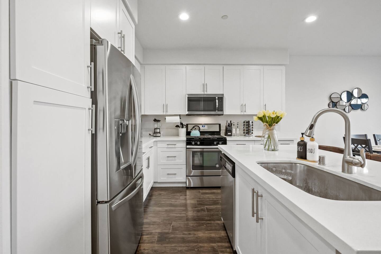 KEY HIGHLIGHTS: --> EV CHARGER / PARKING: garage plus two dedicated parking spaces, additional street parking available inside the community. --> BEDROOM COMFORT: Plush mattresses in bedrooms with 2 queens and 2 twins, designed for a restful sleep plus dressers, privacy blinds for a longer stay. --> ACCESSIBILITY: One-story, stair-free entry, walk-in shower in the master suite for easy access. --> MODERN KITCHEN AND DINING: Our kitchen is fully stocked and features a breakfast bar, new stainless appliances, and a gas stove, making it perfect for preparing meals or entertaining guests. The open floor plan includes a dining area that opens up to the great room, providing multiple spaces for enjoyment and relaxation. --> OUTDOOR LIVING AREA: Lush backyard garden patio for relaxation or dining al fresco. In the front, the community space includes a BBQ, firepit, Bocce Ball and pet walking area. --> CONVENIENCE: Washer and dryer in home. --> SAFE COMMUNITY AND AMENITIES: Step outside to enjoy the beautifully maintained community grounds, featuring an outdoor fireplace, BBQ patio, seating for gatherings, a bocce ball court, and a pet-friendly area for your furry friends to explore. --> PRIME LOCATION FOR EXPLORERS AND PROFESSIONALS: Located 3 min from the 55, 22, 57 freeways, our home offers easy access to Irvine + Tustin, Disney, Ducks Hockey and Angels Baseball stadium, many grocery and shopping centers, business parks, and dining options. 2 min from Santiago Canyon College. LOCATION AND ATTRACTIONS Centrally located 1 mile off 55 freeway and 5 freeway • CHOC, Providence and other hospitals 10 minutes • 10 min to Irvine, Tustin, Anaheim Hills • Easy access to shopping, dining, and outdoor activities. • A serene, quiet street that's still "super close to the action." • Minutes to Disneyland, Anaheim Convention Center, Angels Stadium, and more. ACCESSIBILITY FEATURES No stairs for entry and a master suite designed to accommodate guests with mobility needs. FOR PET OWNERS A small dog door and pet-friendly community areas ensure your furry friends enjoy their stay as much as you do.